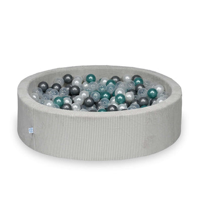 Ball Pit 110x30 Corduroy Grey with balls 400 pcs: transparent, pearl, silver, metallic turquoise