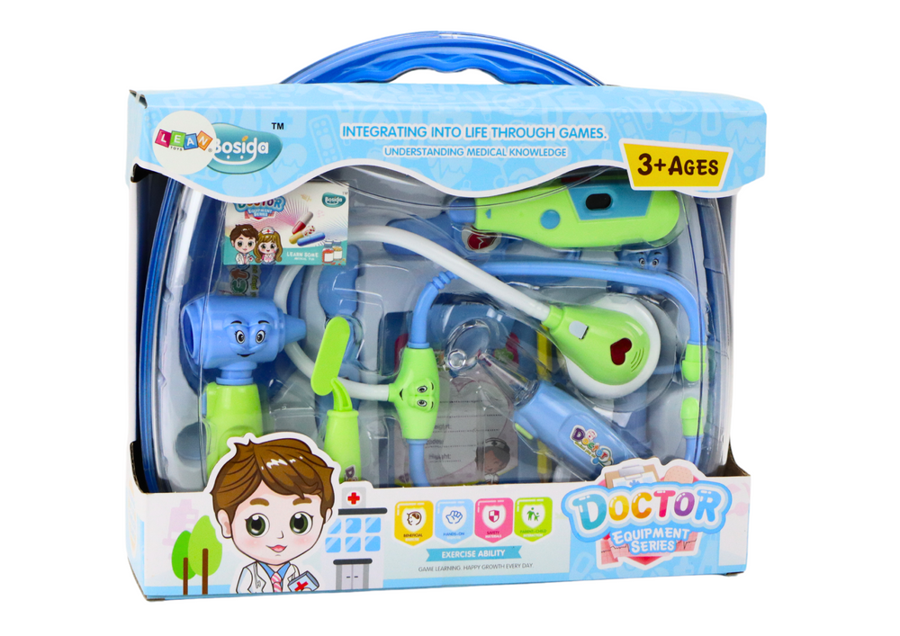 Kleine dokter medische kit in koffer licht blauw is een educatief speelgoed dat jonge kinderen aanspreekt. Deze set bevat een stethoscoop met licht- en geluidseffecten, een thermometer, een spuit, schaar, pati�ntenkaart en andere medische accessoires. De handige koffer biedt eenvoudige opslag en transport, zodat kinderen hun doktersrolspel overal mee naartoe kunnen nemen. Stimuleer de verbeelding en leer terwijl je speelt met deze compleet uitgeruste doktersset. Perfect voor het ontwikkelen van sociale vaardigheden en het vergroten van interesse in de gezondheidszorg.