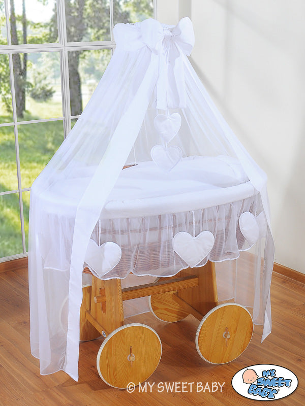 Rieten mand voor baby's. Romantische rand van kleurrijk katoen en witte tule, met decoratieve ruches.