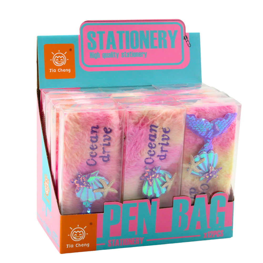 Pluche etui met zeemeerminstaart-pailletten in roze en paars is de perfecte keuze voor kinderen die van zeemeerminnen houden. Dit etui in pastelkleuren heeft een schattig ontwerp met glinsterende pailletten en schelpen. Het is zacht en duurzaam, ideaal voor het opbergen van pennen, potloden en andere schoolspullen. Een must-have voor iedere jonge zeemeermin fan.