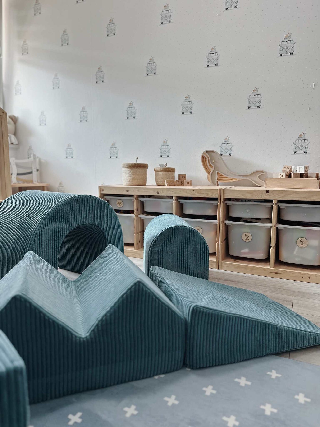 Mimii: Grootste schuimspeelset met micro‑ballenbad - Corduroy Groen + 100 ballen transparent, pearl, light mint, light gold