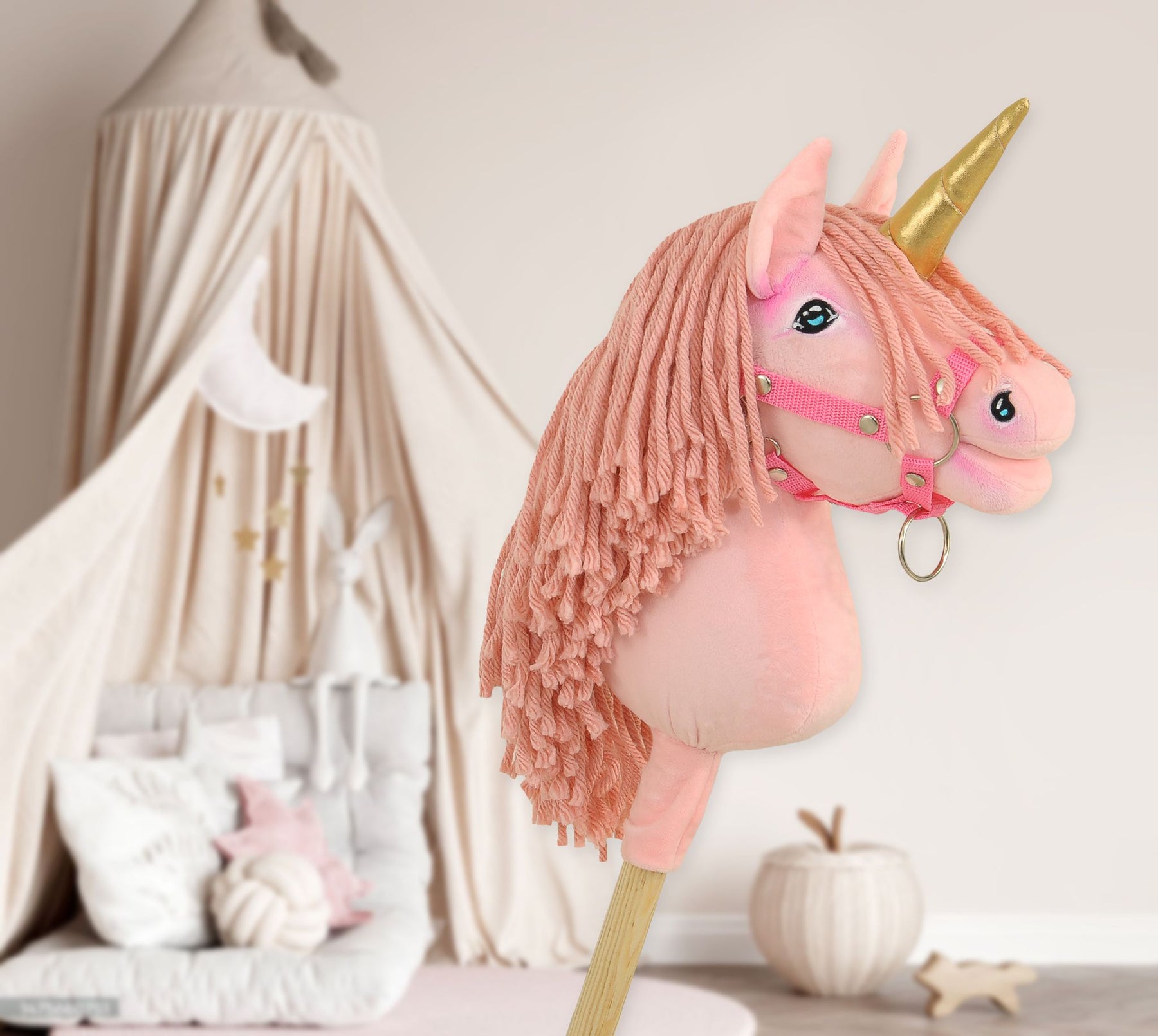 Hobbypaard Kleine eenhoorn op stokje - roze met roze manen en gouden hoorn
