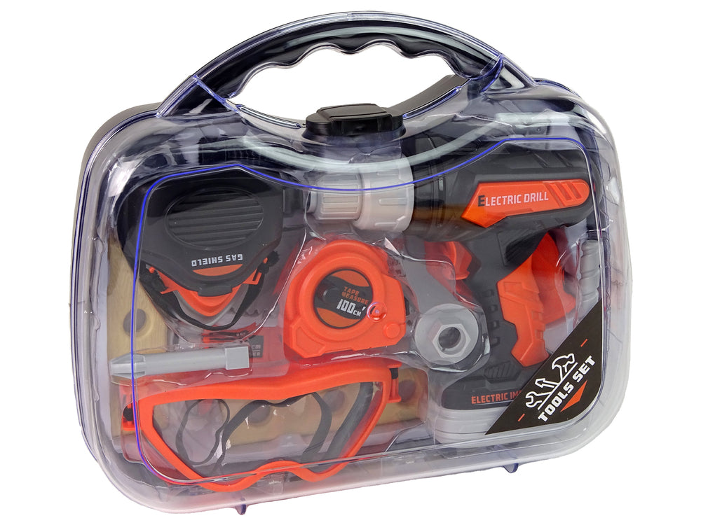 DIY-Kit in einer Werkzeugkiste Akku-Bohrer Schutzbrille