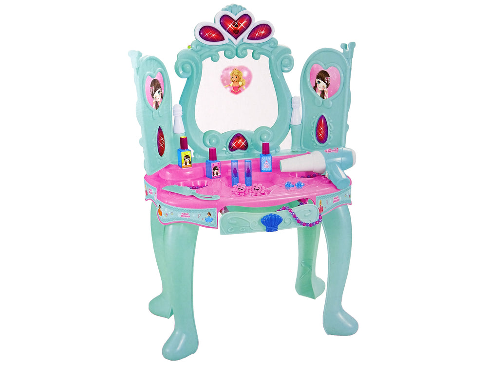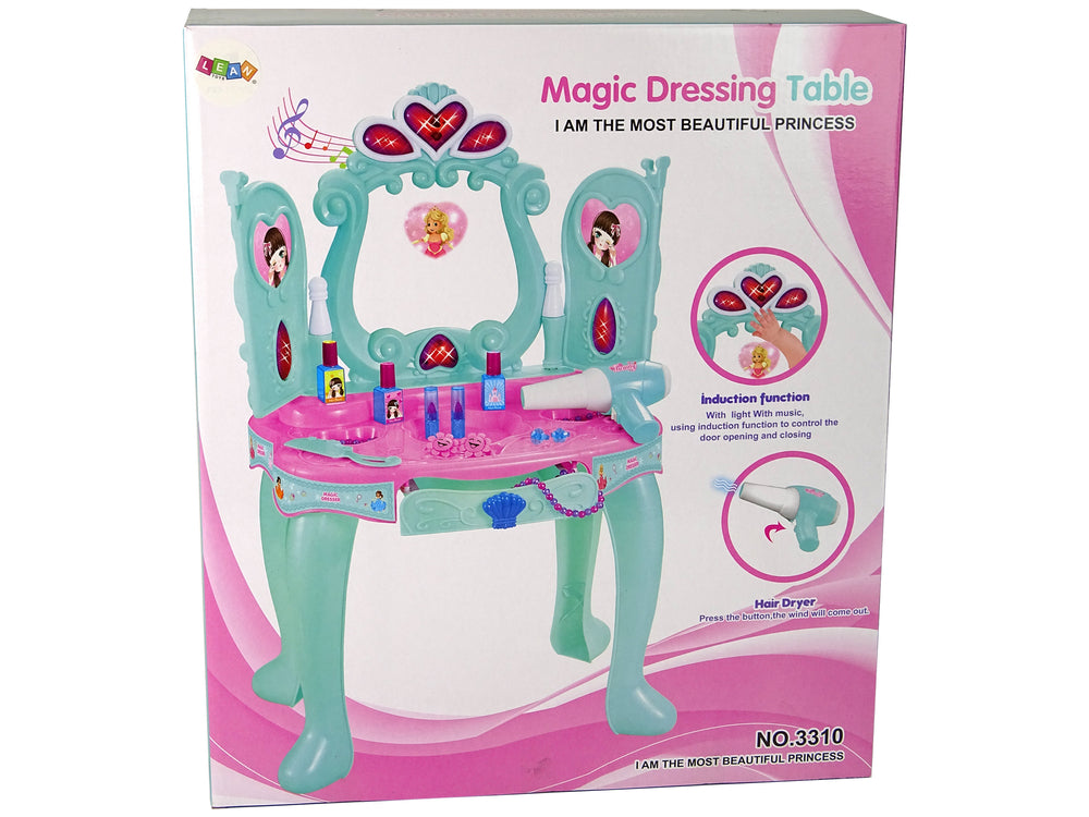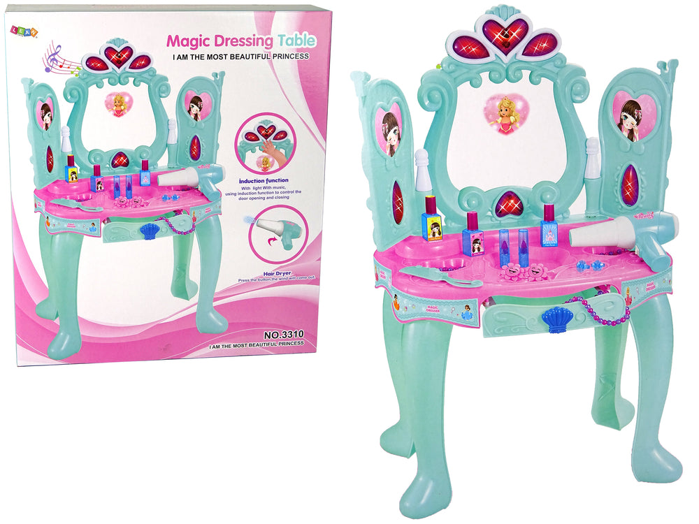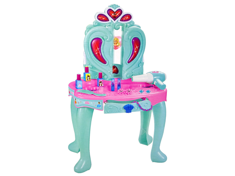 Verleihen Sie der Spielecke Ihres Kindes mit dem Beautyset-Schminktisch-Zubehör in Mintgrün einen Hauch von Charme. Dieses wunderschöne Set zeichnet sich durch raffinierte Details und dezente rosa Akzente aus, die einen mädchenhaften Look erzeugen. Es ist wie ein Schönheitssalon im Miniaturformat, komplett mit blauem Haartrockner, Kamm, Halskette, Glitzerflaschen, Lippenstiften und kreativen Aufklebern. Perfekt für stundenlangen Spaß und die Entwicklung von Vorstellungskraft und Kreativität!