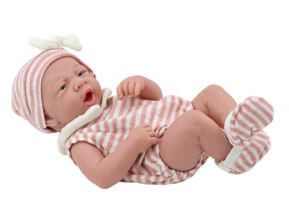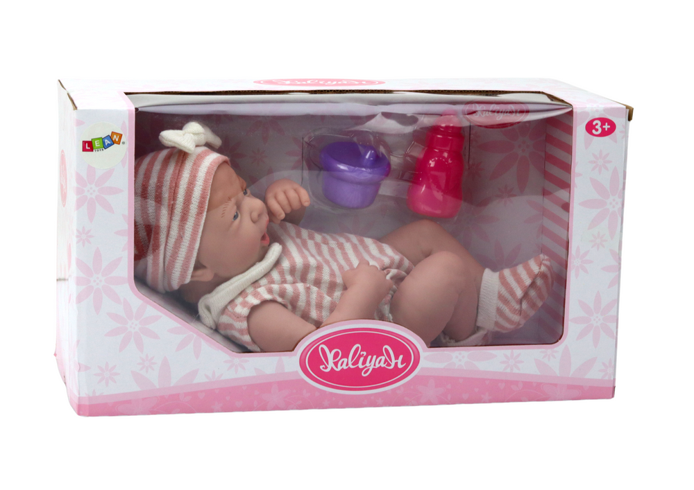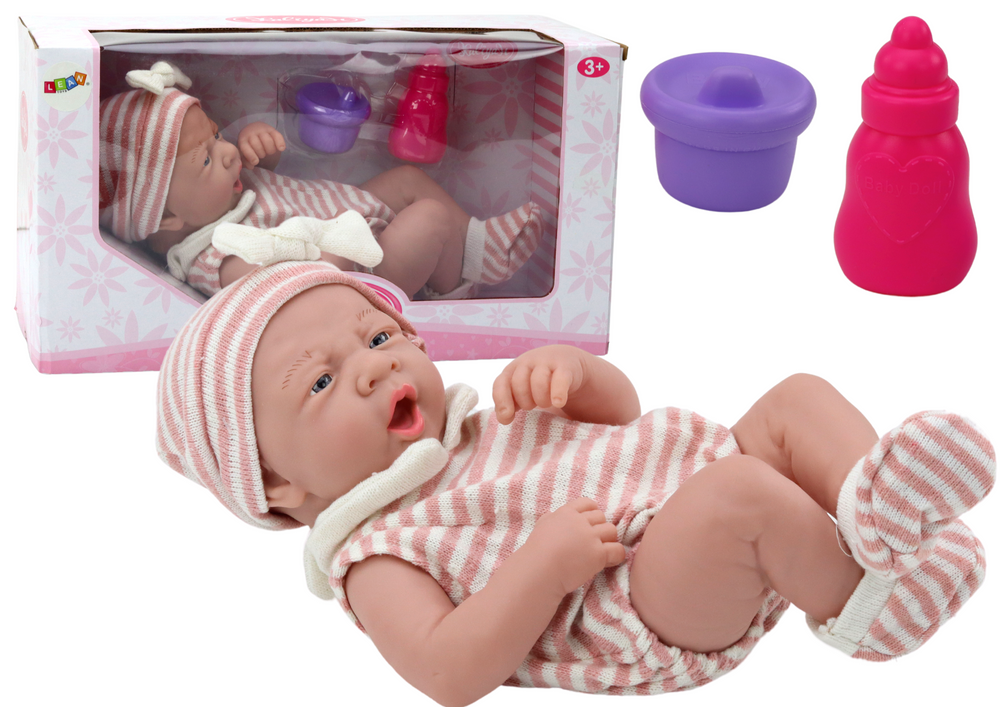 Entdecken Sie die wunderschöne Neugeborenen-Babypuppe, perfekt für junge Betreuer! Diese realistische Babypuppe hat detaillierte Gesichtszüge und lebensechte Falten an den Beinen. Mit beweglichen Armen und Beinen kann Ihr Kind endlos mit ihr spielen und sich um sie kümmern. Die Babypuppe trägt einen süßen gestreiften Body, eine passende Mütze und süße Socken. Zusätzlich sind im Set Fläschchen enthalten, damit Ihr Baby sie füttern kann. Dies ist das ideale Geschenk für neugierige und fürsorgliche Kleine, die sich gerne um ihre Puppen kümmern!