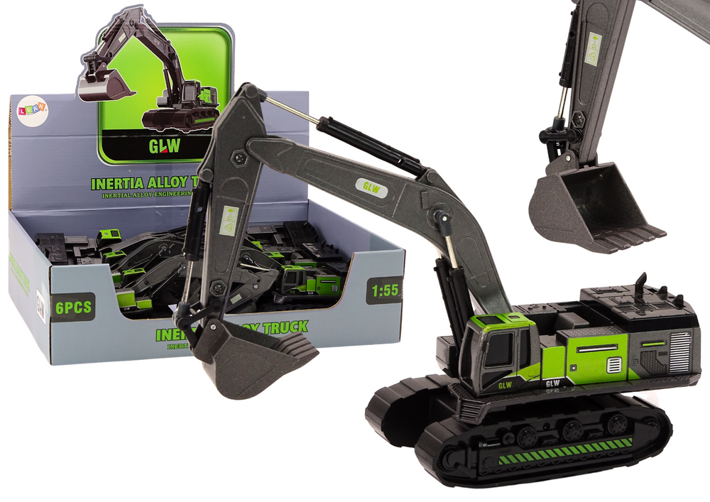 Der Raupenbagger mit Metallschaufel in Schwarz mit grünen Elementen bietet ein detailreiches Spielerlebnis. Mit seinem verstellbaren Ausleger, der reibungsbetriebenen Bewegung und der um 360 Grad drehbaren Kabine ist dieses Fahrzeug perfekt für realistischen Spielspaß. Ideal für junge Baubegeisterte, die ihre Fantasie einsetzen möchten.