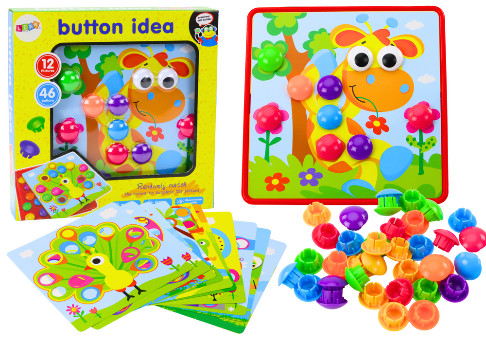 Fördern Sie die Kreativität und Feinmotorik Ihres Kindes mit unserem einzigartigen Fotopuzzle-Set! Dieses Set enthält 12 wunderschöne Bilder mit Öffnungen für bunte Knöpfe und nicht weniger als 46 bunte Knöpfe. Lassen Sie Ihr Kind die Puzzles vervollständigen, indem es die Knöpfe an den richtigen Stellen platziert und so seine Fantasie und Fingerfertigkeit anregt. Perfekt für stundenlangen Spaß und Lernen!