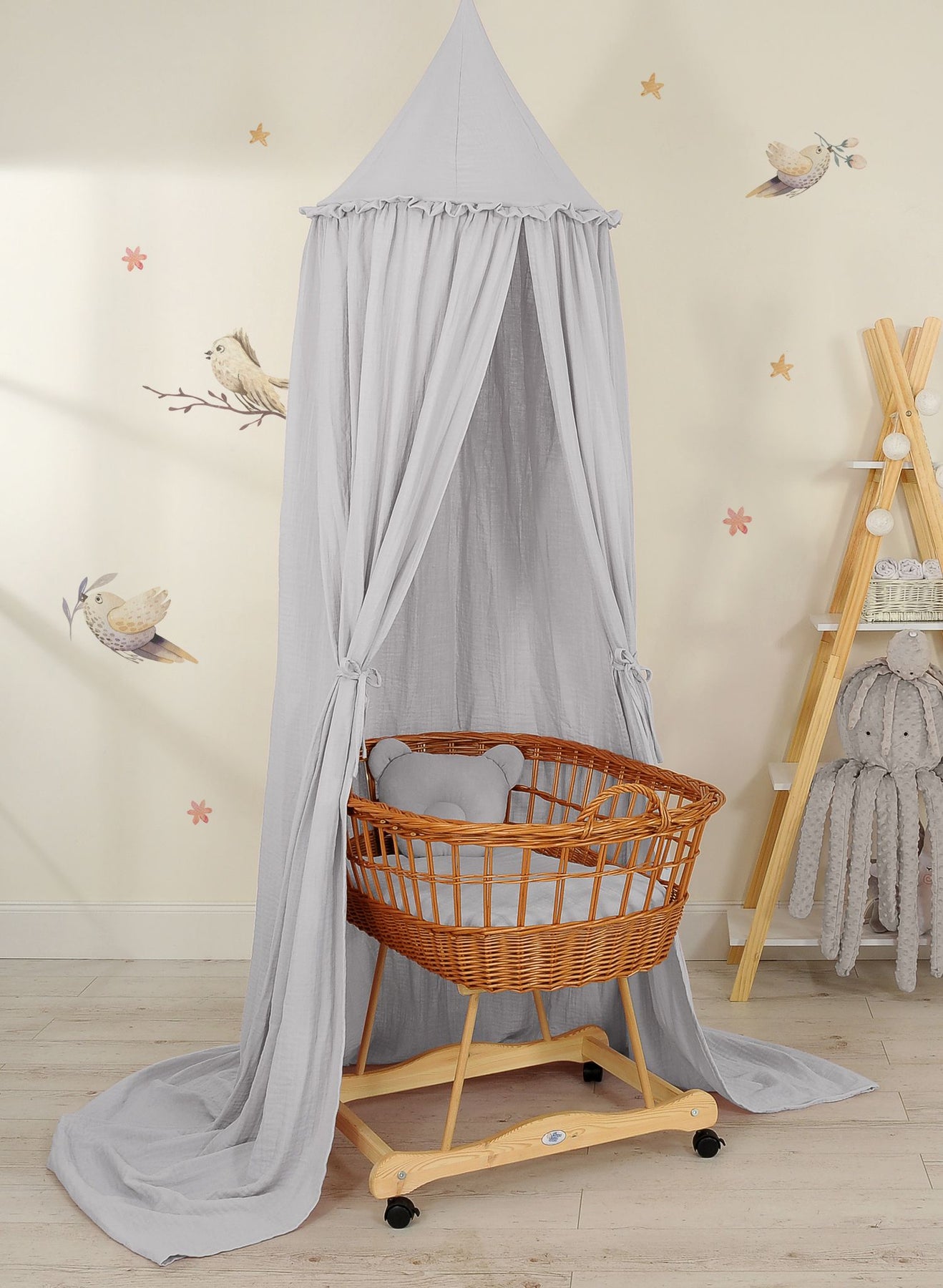 Eine effektive, langhängende Markise. Ein schönes Element für das Kinderzimmer. Es kann als einzigartige Dekoration eines Babybetts verwendet werden, kann aber auch ein wunderbarer Ort zum Spielen sein. Über dem Bett hängend schützt der Baldachin vor zu viel Licht und Lärm und schafft eine gemütliche Atmosphäre. und einen sicheren Platz zum Ausruhen im Kinderbett. Die Markise lässt sich einfach an der Decke montieren. Die Länge von 260 cm ermöglicht es, die Enden auf dem Boden abzulegen. Dadurch entsteht ein perfekter Versteck- und Spielbereich für ältere Kinder. Der Baldachin besteht aus 100 % Baumwollmusselin. An den Seiten befinden sich praktische Bänder, mit denen Sie das Sonnensegel festbinden und so ein schönes Zelt gestalten können. Die Kante oben kann entfernt werden. Der Stoff ist bei 30 Grad waschbar.