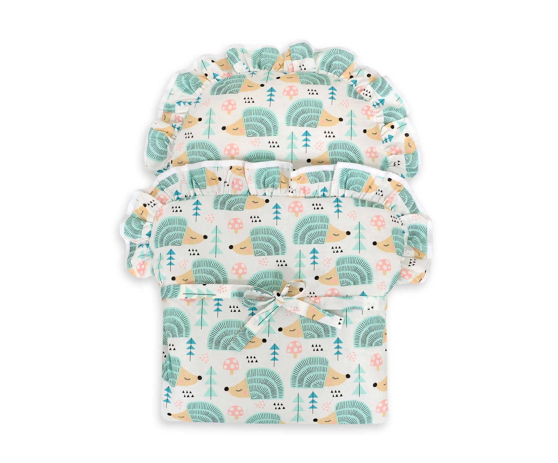 Die Ränder der Wickeldecke sind mit einer schönen Rüschenkante versehen. Das Pucktuch kann mittig mit einer Schleife gebunden werden.