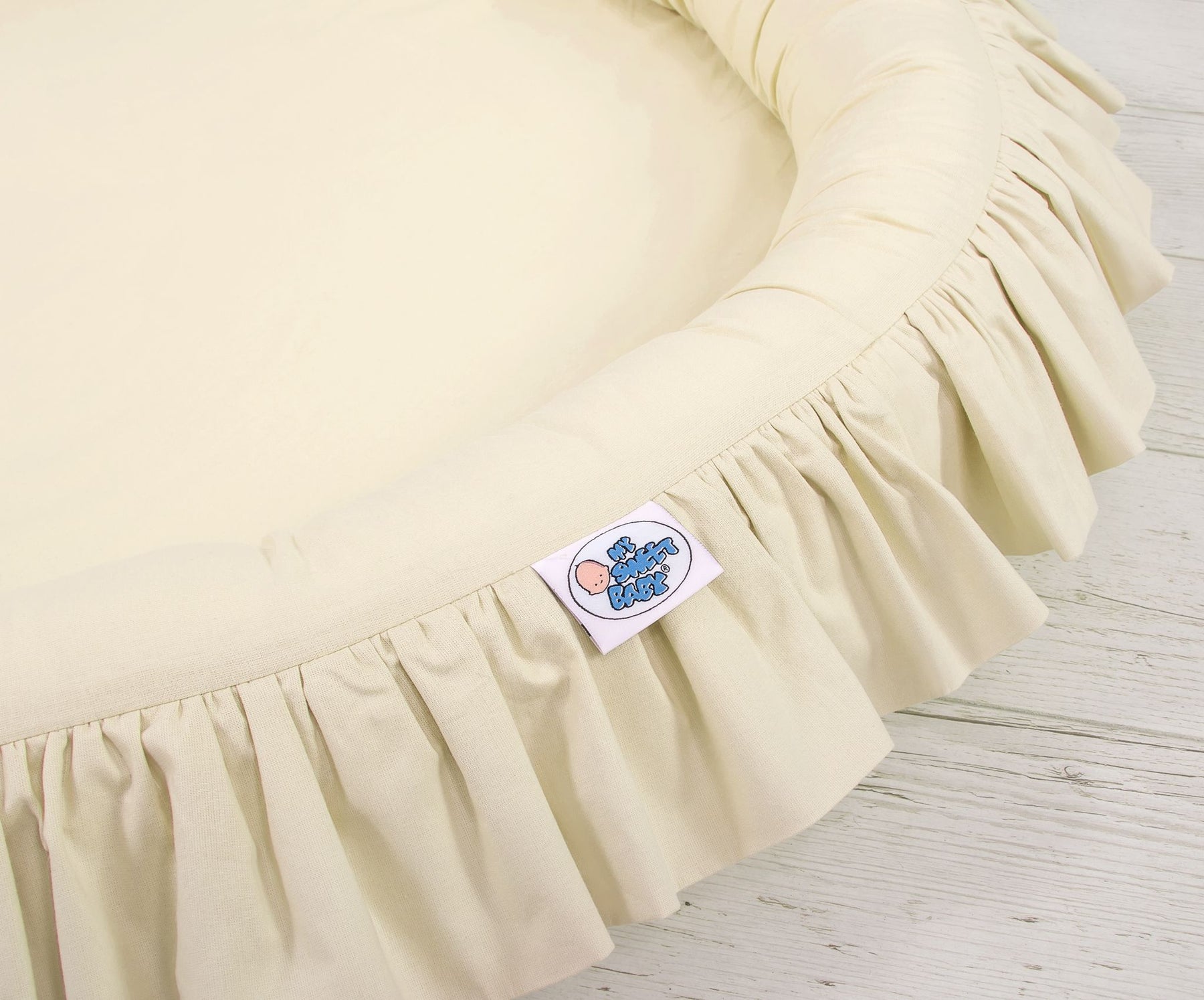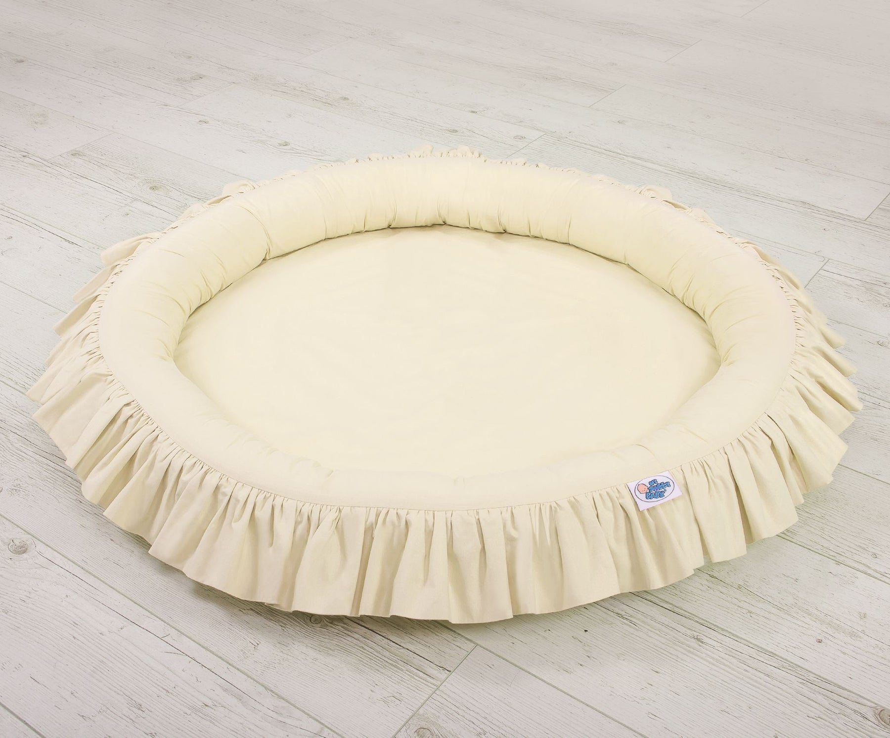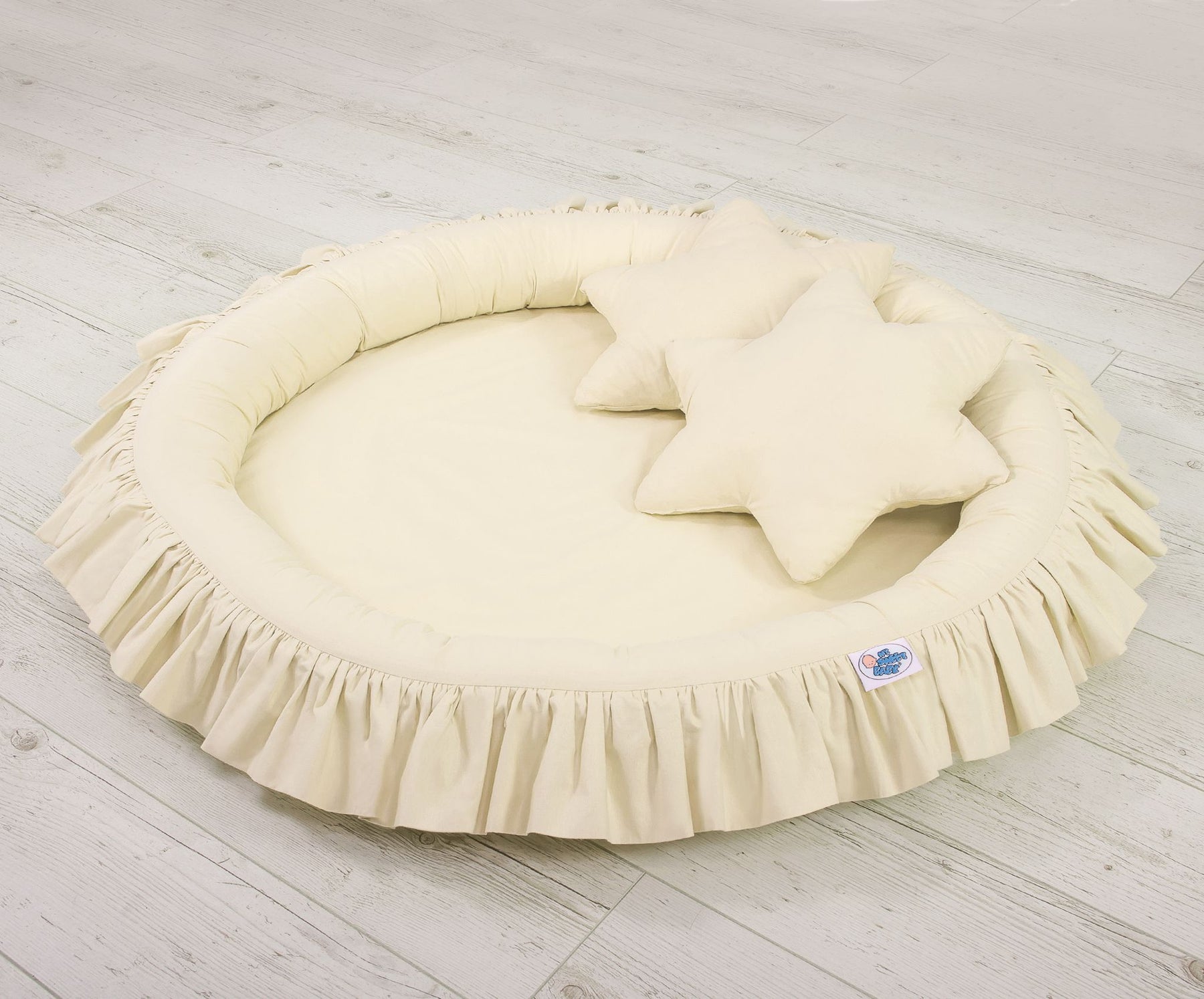 L anderes Nest mit Volant . Ein funktionales und praktisches Nest zum Spielen. Das Nest eignet sich hervorragend als Spielwiese , oder als Bodennest zum dauerhaften Luftholen. Das Nestchen mit Volant kann bereits ab den ersten Lebenstagen als sicherer Ruheplatz genutzt werden. Die weichen Kanten bieten Sicherheit für die Babys . Es eignet sich perfekt als Spielplatz, auf dem viele Spielsachen ihren Platz finden. In Kombination mit dem langen Baldachin entsteht aus dem Rüschennest ein wunderschönes Spielzelt.