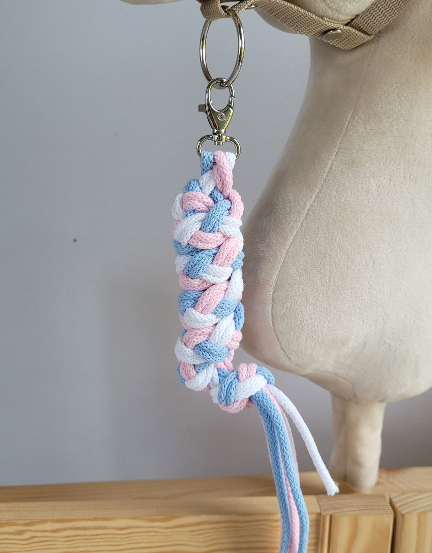 Anbindestrick für Hobbypferd aus Doppel - blau/hellrosa/weiß